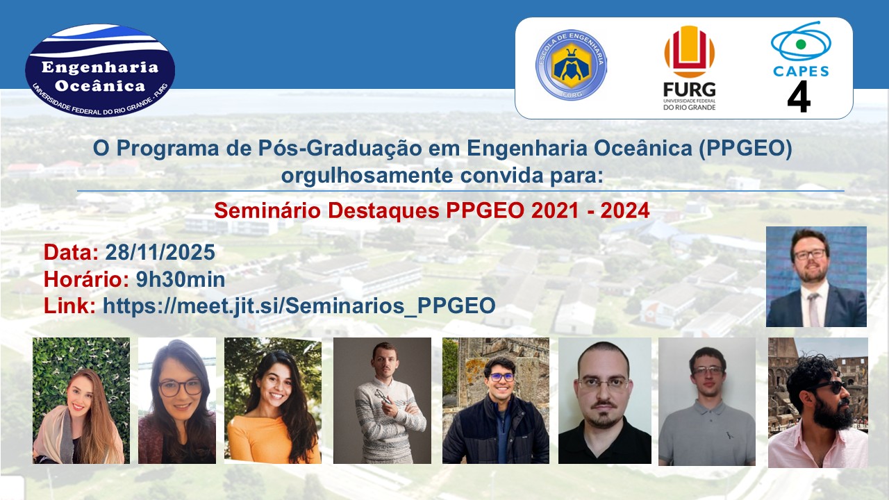 O Programa de Pós-Graduação em Engenharia Oceânica (PPGEO) da Universidade Federal do Rio Grande – FURG orgulhosamente convida para o Seminário Destaques PPGEO 2021 – 2024, onde os seguintes egressos do PPGEO serão homenageados em diferentes categorias de distinção: